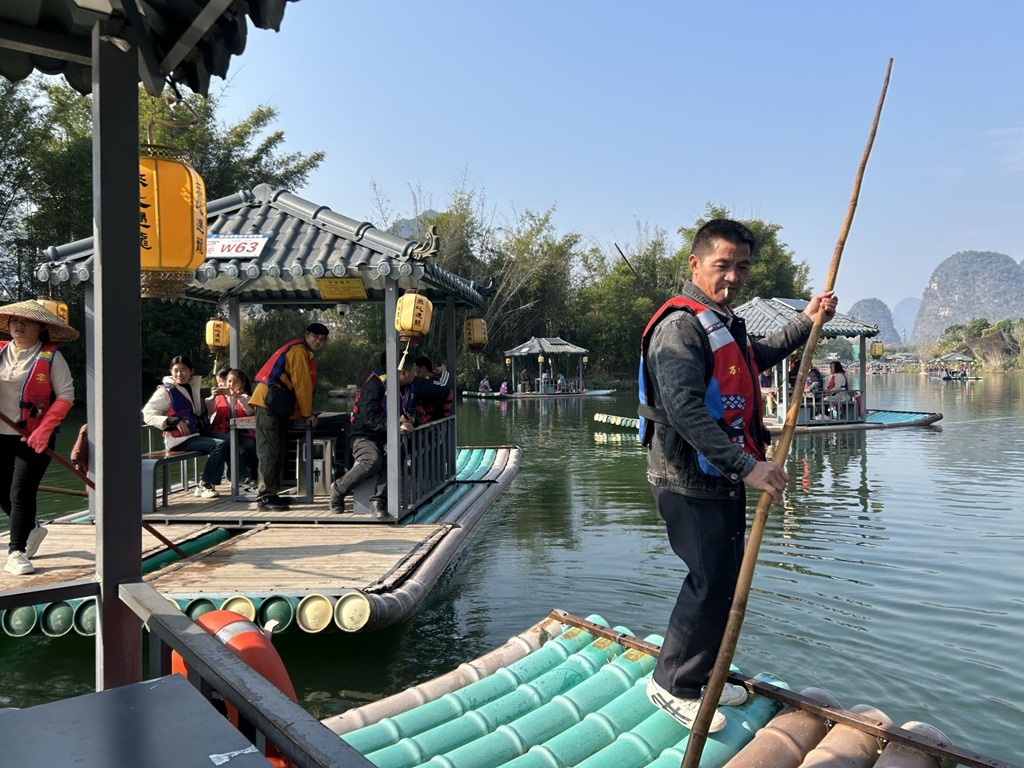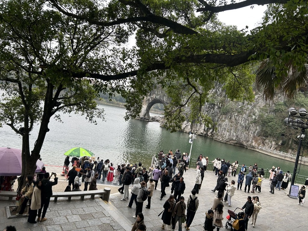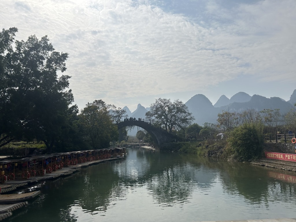 阳朔,其实是桂林下辖的一个旅游县城,有云 “桂林山水甲天下,阳朔山水甲桂林”。相较于桂林市区,这里的风景更具特色。富里桥为明代永乐年间所建的料石结构单拱桥,桥面、栏杆及台阶均由方石构筑,桥头各有古树一株,桥拱与水中倒影相接形如满月。北宋王希孟的《千里江山图》描绘了壮丽的青绿山水而阳朔的喀斯特山水(如漓江风光)被誉为 “活着的《千里江山图》”。《桂林千古情》是一个特色表演,我们下午去这个主题公园里面玩各种互动游戏,到傍晚则观看这个室内表演,这个表演在舞台上采用了很多基于水的表现手法,气势恢宏(有波涛、暴雨等等,都是真实的水流),再现了桂林的历史文化与民族风情,很值得一看。